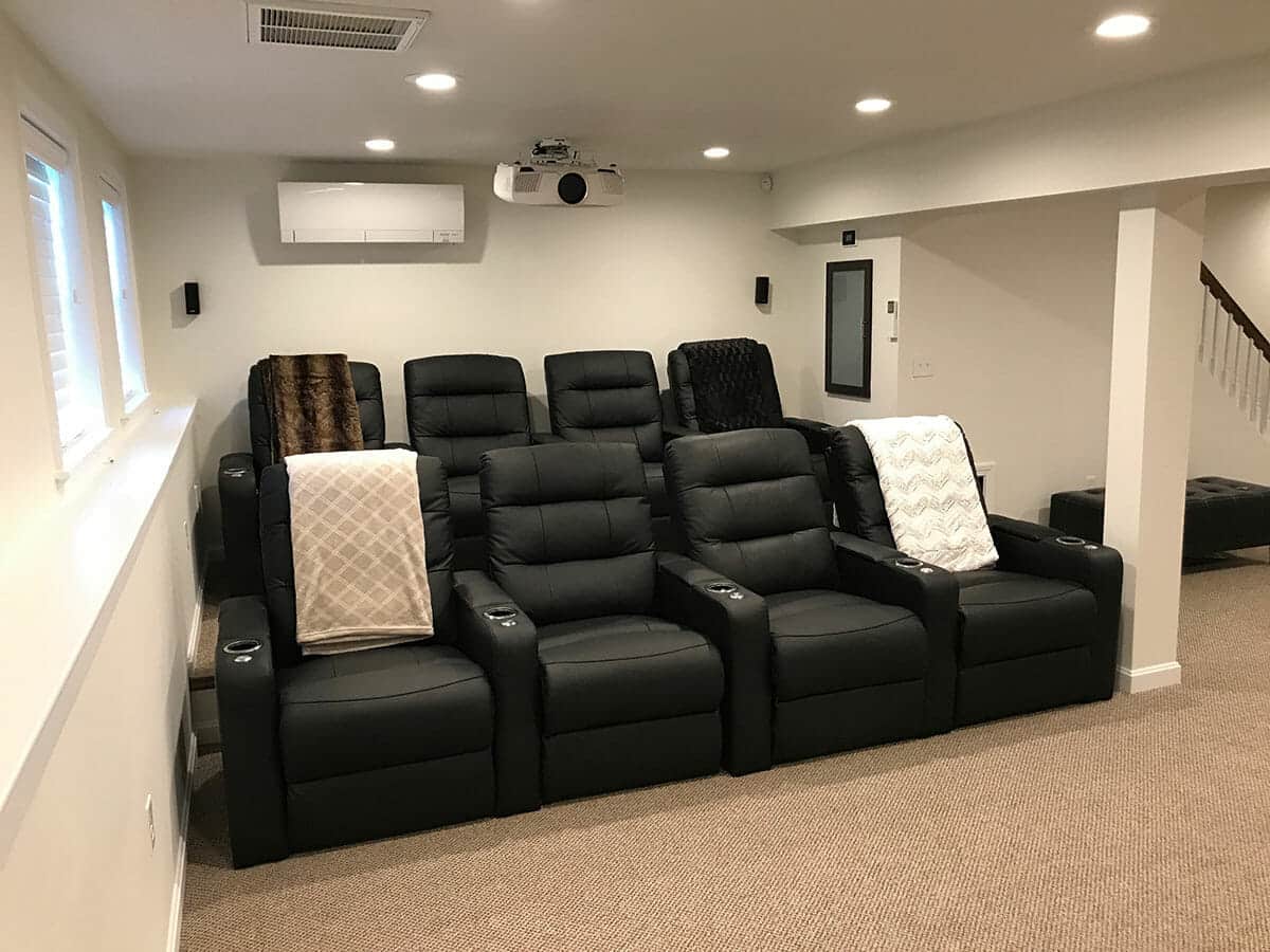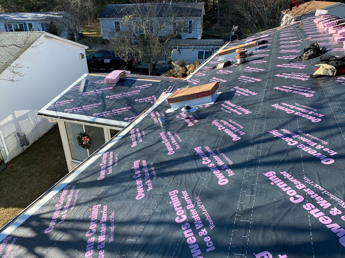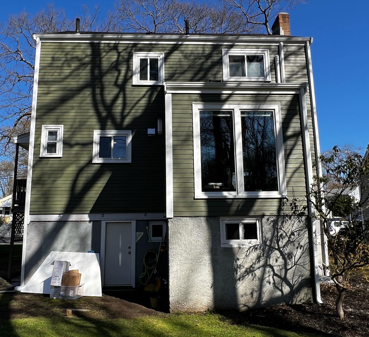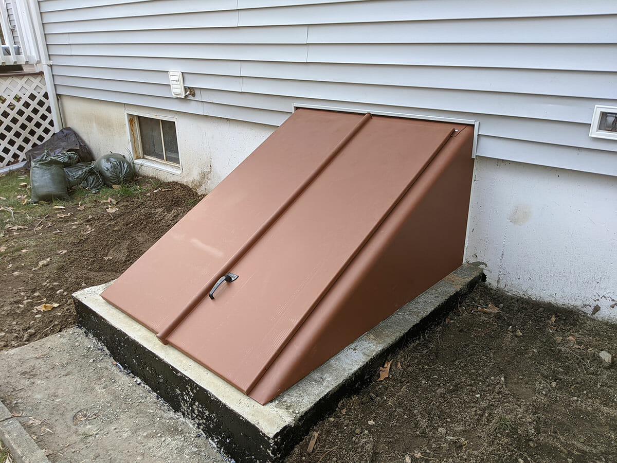 Deck rebuild with pressure treated wood frame and AZEK Decking in Mahogany with White Premier railings and Black balusters. Azek Dry Space was added under the deck.